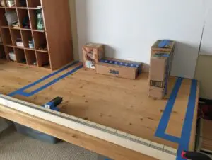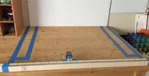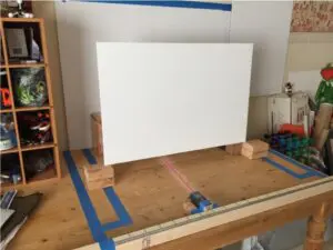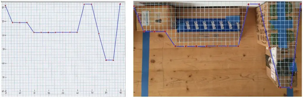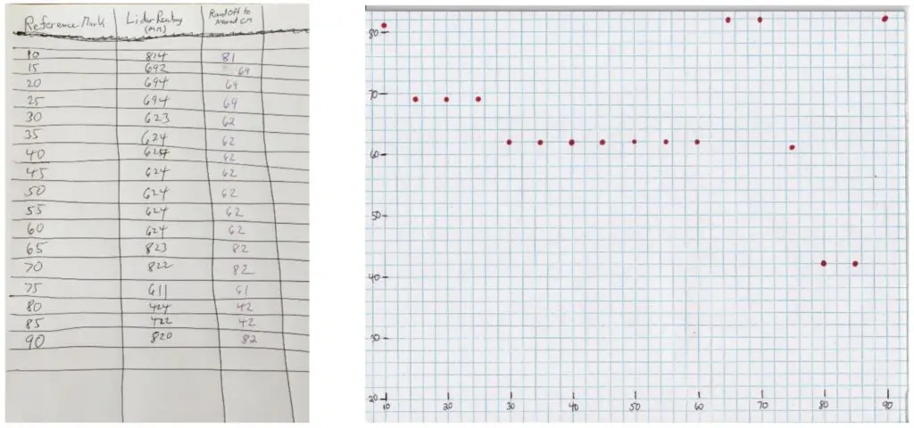 Explain that in a real-life situation, lidar data points are taken without actually seeing the objects or landscape being imaged. In fact, data collection may be completely automated, with nobody actually looking at the landscape. Invite participants to try their hand at mapping a landscape that they cannot see: Place a piece of foam core in front of the boxes as shown. The foam core must be mounted with a gap at the bottom so that the laser can shine underneath it to the boxes. Have one participant secretly set up the boxes to make a landscape, and a second participant take lidar measurements and do the graphing to try to construct an image of the landscape.