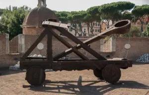 Mechanical engineers design machines that involve force, energy, motion, and power. In 400 BCE, engineers in Greece designed a machine to launch arrows and stones during warfare—the catapult. A catapult is a type of lever that consists of three essential parts: a stable base, a launching arm, and a source of tension. When the arm of the catapult is pulled backwards, the tension and potential energy increase. When the arm is released, the potential energy turns into kinetic energy and is transferred to the object being launched. It’s the kinetic energy that propels the object toward its target.